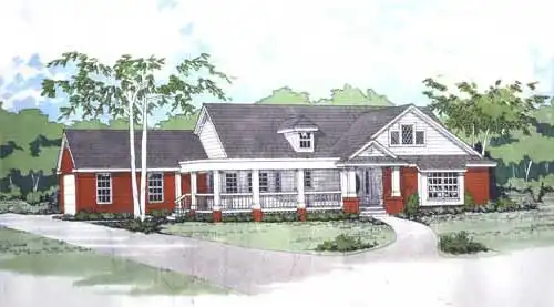 The country style home features a wraparound front porch and a garden room at the rear.