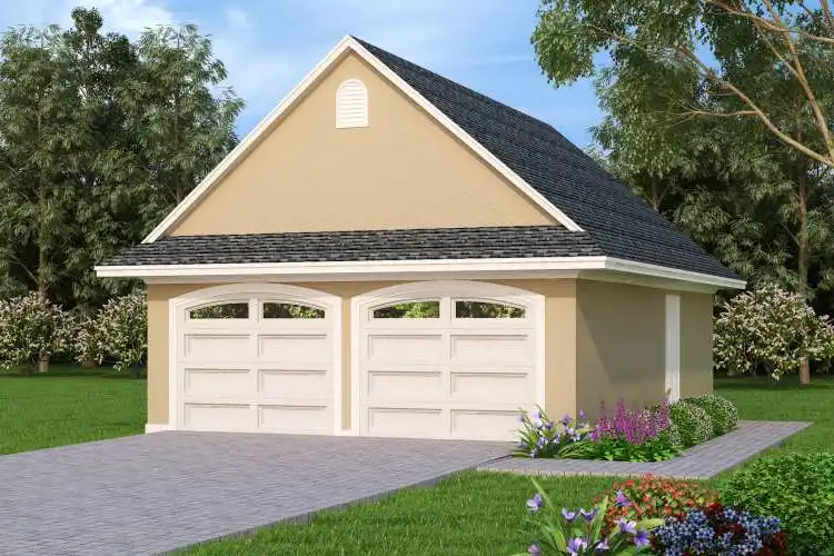 If your home does not have a garage or if you need additional garage space, this detached unit is the perfect solution. The arched garage door openings and the stucco exterior finish will blend well with a home that has a Tuscan, Mediterranean or European style.