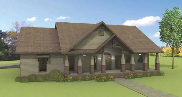 This elegant rustic retreat will welcome you with two porches. A large Great Room is highlighted with a cathedral ceiling and gas vent-less fireplace. The large Kitchen/Dining area boasts lots of storage, an island and built-in recycling center. A at home office area and large Pantry are within steps of the Kitchen. The Laundry/Craft Room serves a dual purpose & is close to the rear entry. Bedrooms 2 and 3 each have walk-in closets or an optional desk area. The Master Suite is made private with an angled entrance. The spa style bath has a huge shower and dual sinks.
