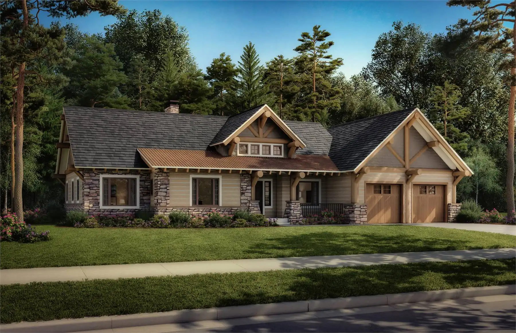 House Plan 3131 would make an awesome choice if you need a modest rustic home made for the mountains or another rural location! It has 1,416 square feet, three bedrooms, and two bathrooms in a traditional ranch layout--living spaces on one side and all the bedrooms grouped on the other. The master suite faces back while the other bedrooms face front, separated by a four-piece hall bath. The open living spaces include an island kitchen beside a dining area, looking out over the cathedral family room. There's also a mudroom/laundry entrance that connects to the garage. All this comes wrapped up in a rustic exterior with log and stone elements, so House Plan 3131 is ideal for anybody looking for a great cabin with natural style!