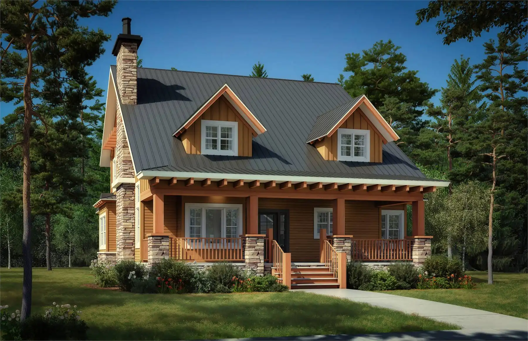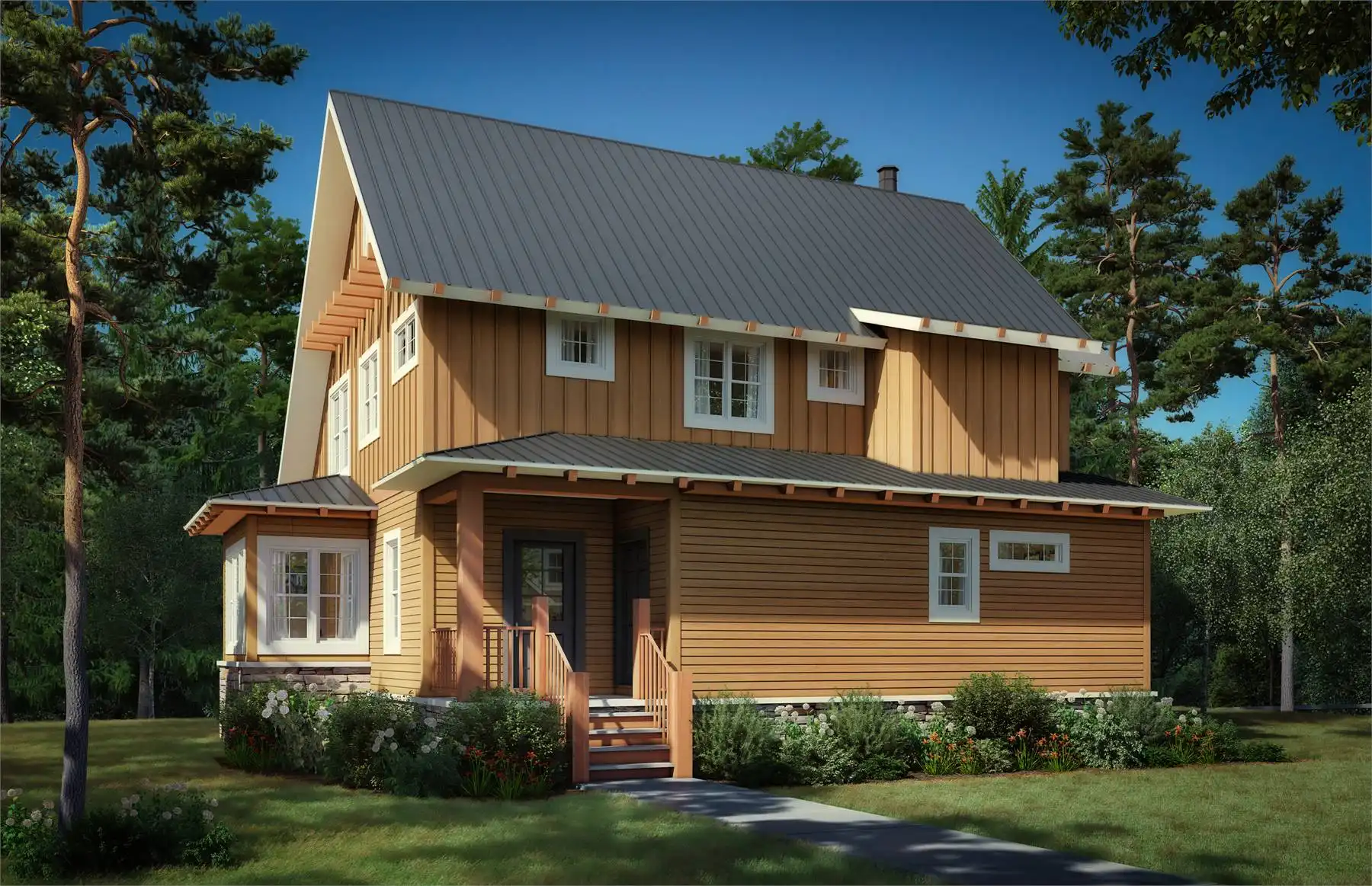 A sizable front porch welcomes visitors to this affordable country-style house plan, with three bedrooms, two baths and 1,825 square feet of living space. Host any gathering in the spacious great room of this home plan, enhanced by a vaulted ceiling and a focal-point fireplace. The open kitchen includes an island snack bar for four. The bright dining area is perfect for any meal. The master bedroom is a relaxing haven. The luxurious bath boasts a standard tub, a single sink, a makeup table and a walk-in closet. Upstairs, two more bedrooms share a study and a full bath. Builders point out the useful laundry area and the peaceful rear porch in this home design.