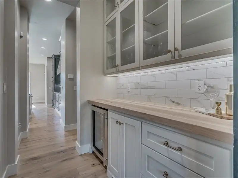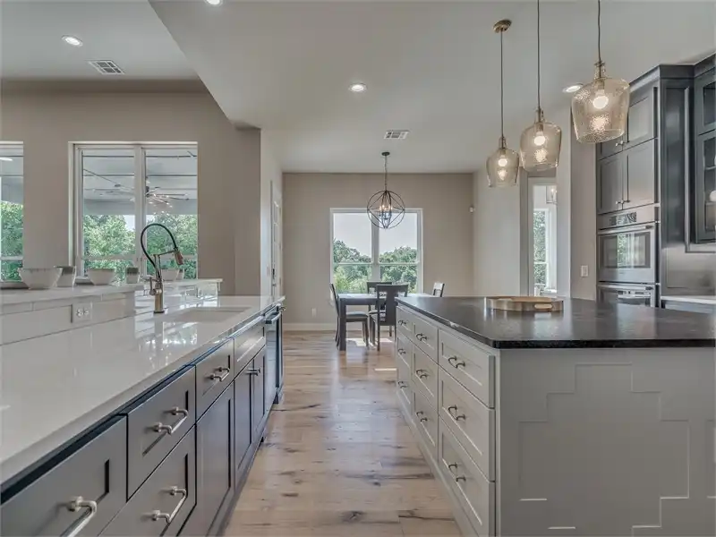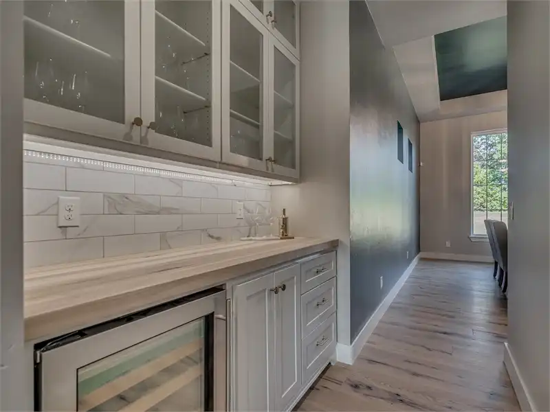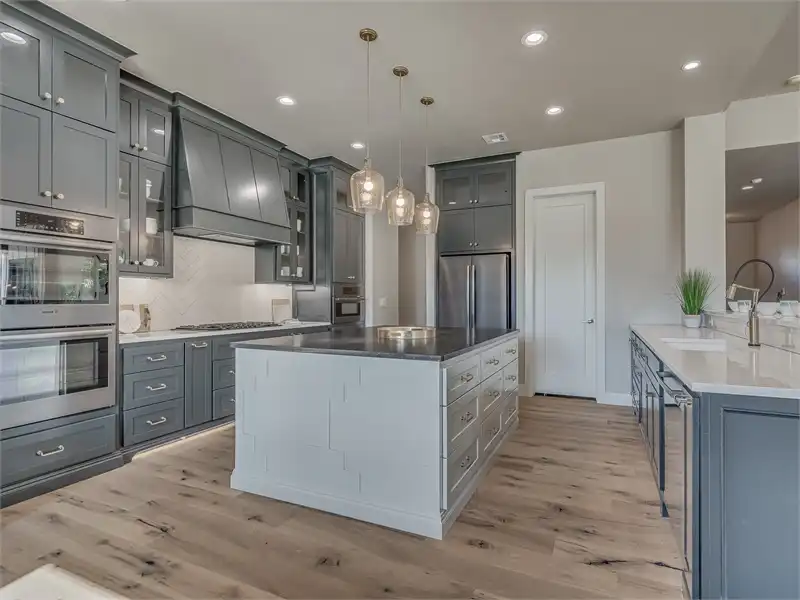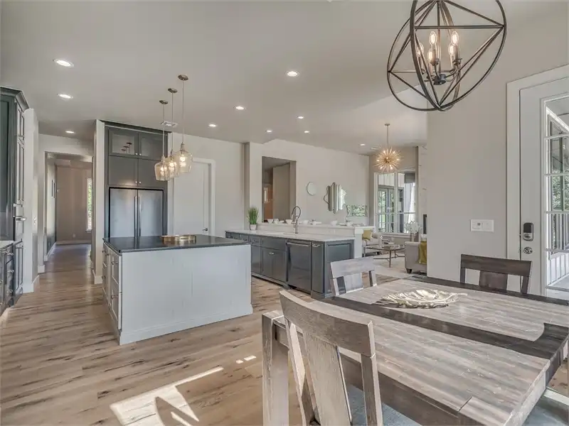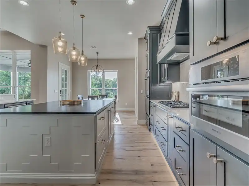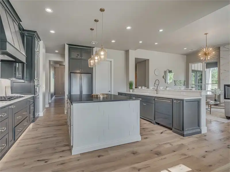A cozy front porch provides entry into a spacious foyer which is flanked by a circular stair and formal dining area. A butler's pantry assists a large gourmet kitchen which includes a walk-in pantry, commercial range, built-in refrigerator and large cooking island.