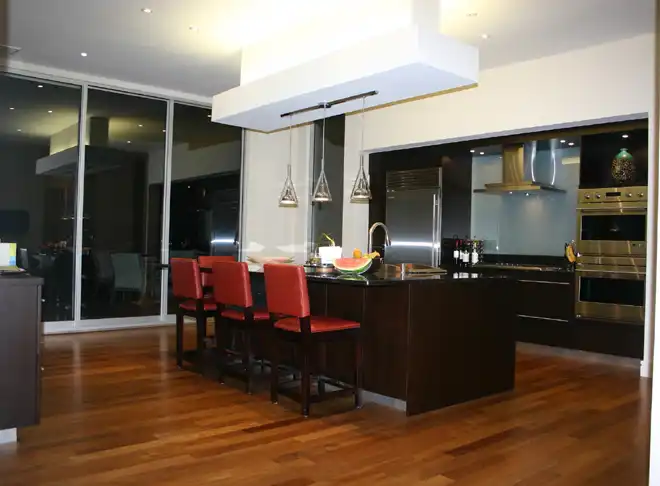 This home also has many green features like ceilings with R-48 insulation, walls with R-24 insulation. Tile and stone floors at upper level absorb the heat during the day and release the heat at night. Radiant heat installed under the tile and stone floors, for an evenly distribution of heat. Cross ventilation provided with large windows and doors at all sides of the house for fast movement of air. In the summer the 10 ft. high ceilings provide a large volume of air for a cooler summer. In the winter fans at low speed push the warm air at the top down.