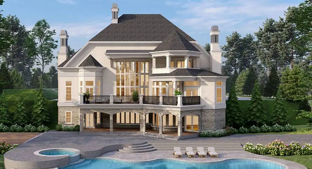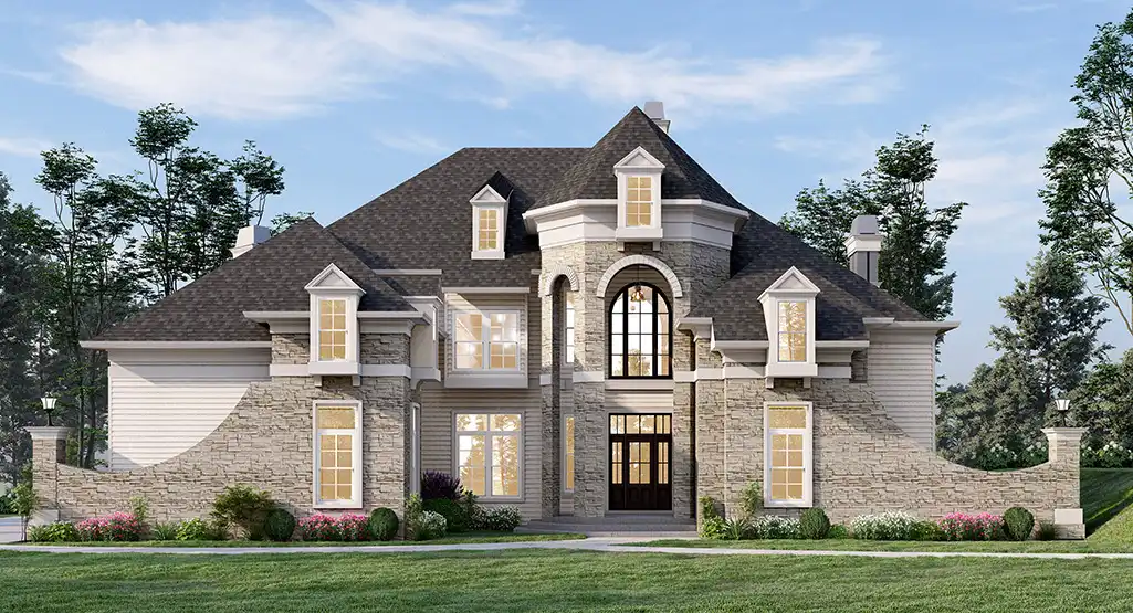Look no further than House Plan 3183 if you need a luxury home with grand European style and a mix of formal and informal spaces. This 4,212-square-foot design has unique curb appeal and tons of glass to bring in natural light and views, and its four bedroom suites give every member of the family plenty of privacy. When you first enter the foyer, you'll find the dining area on one side, a flex room on the other, and the two-story living room with floor-to-ceiling windows across the gallery hallway. Open spaces including the island kitchen, family room, and breakfast nook sit in one rear corner while the master suite fills out the other with a luxurious bath, two walk-in closets, and even its own laundry appliances. Three additional bedroom suites are located upstairs along with a laundry room and unfinished bonus. If you need more than this, you'll be happy to know that House Plan 3183 has a walkout basement that you can finish for over 2,000 more square feet!