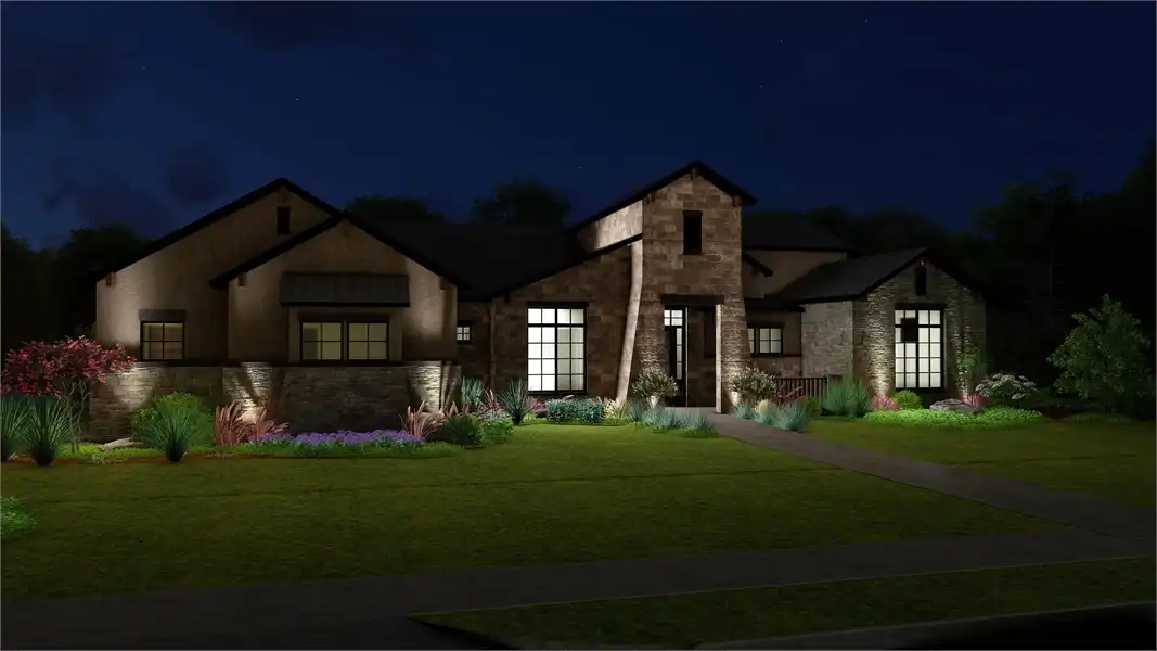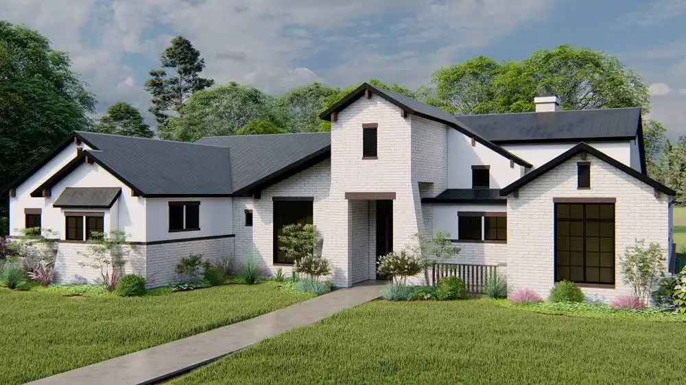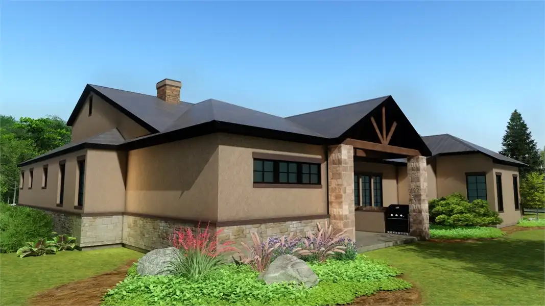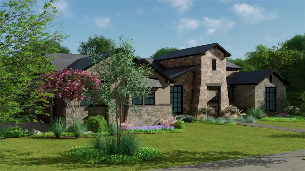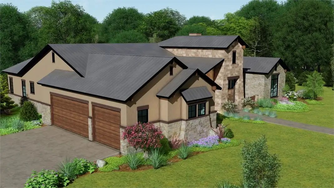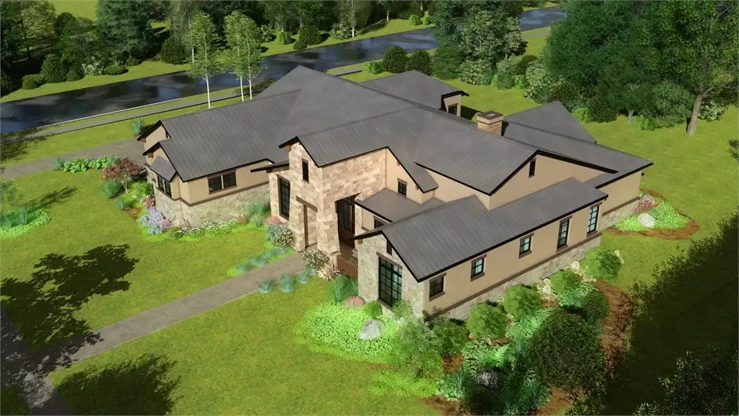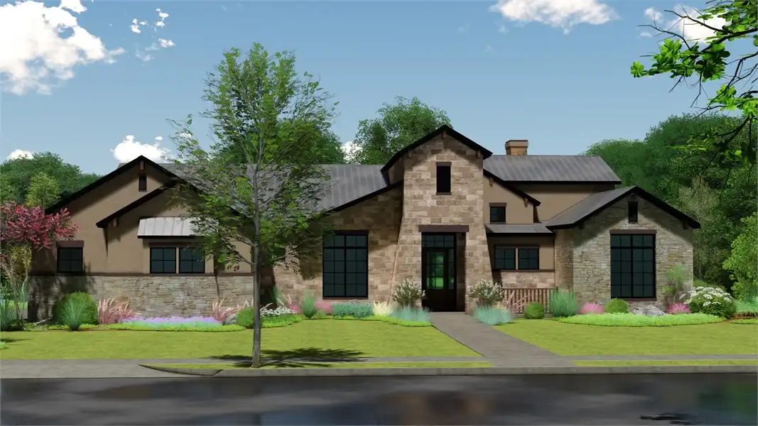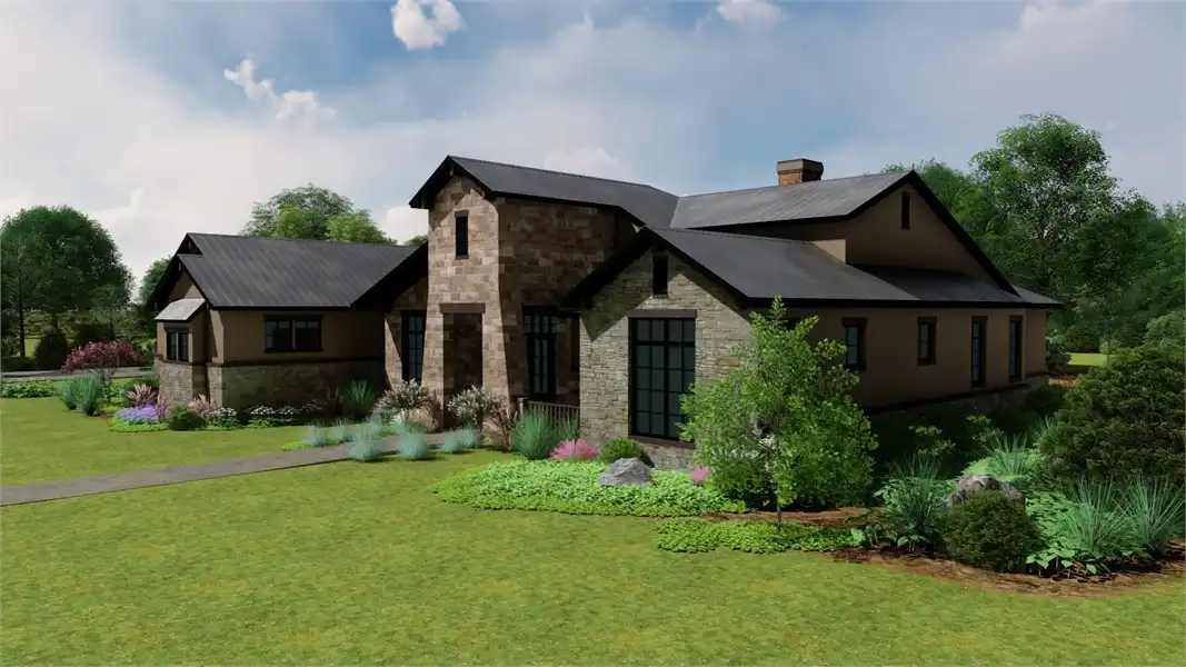 Stone accents and multiple gables enhance this European-style house plan, with a luxury 3,061 square feet of living space, including four bedrooms and three baths. Entertain guests in the sizable great room in this home plan, where a fireplace adds ambience. The island kitchen boasts a snack area for five, plus a handy pantry. Serve meals in the casual dining room, or on the vaulted porch with summer kitchen. The deluxe master suite is a peaceful haven. The personal bath flaunts an oval tub, a seated shower and two vanities. The walk-in closet is well organized for maximum efficiency. Three more bedrooms have direct bath access with walk-in closets. A secluded game room in this home design is perfect for child's play. Builders point out the versatility of the vaulted study.