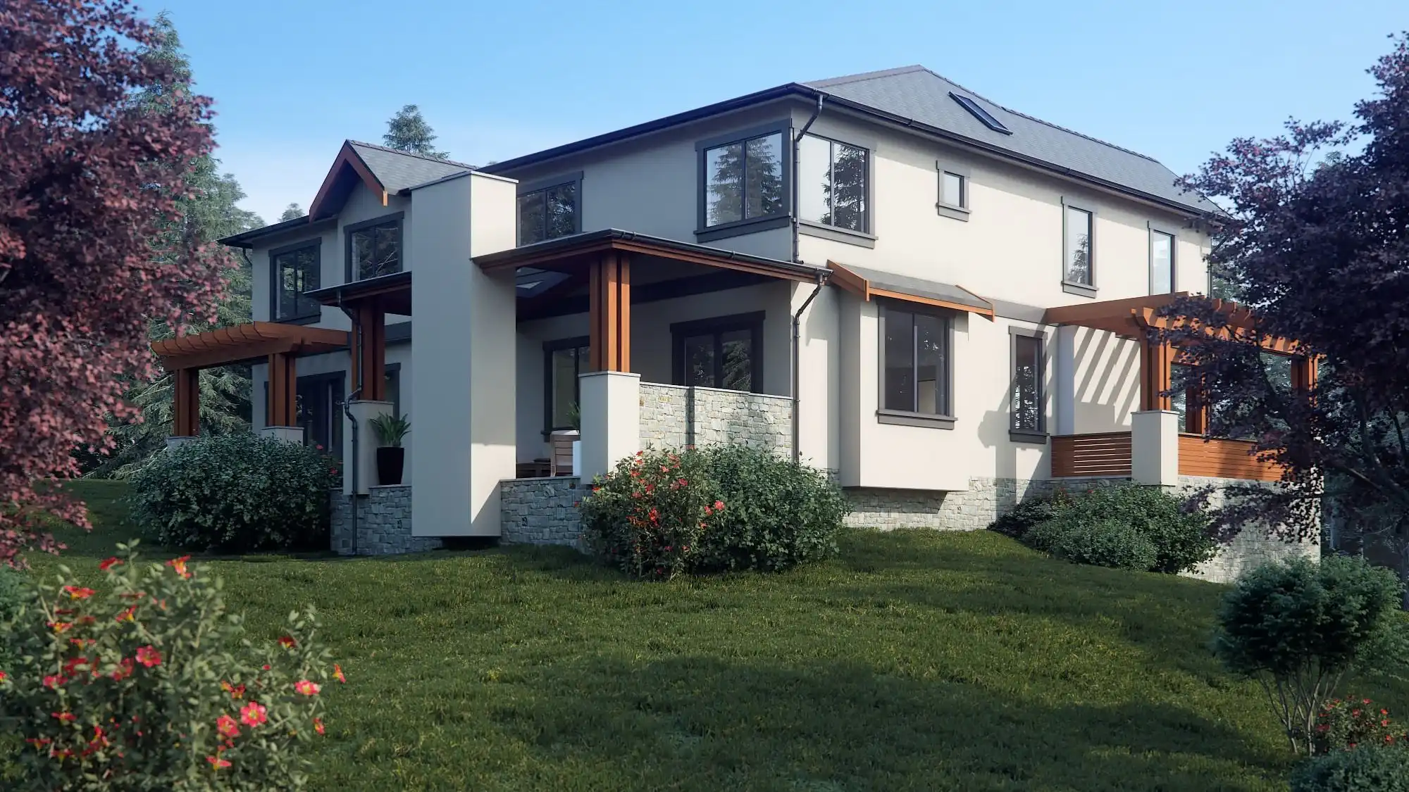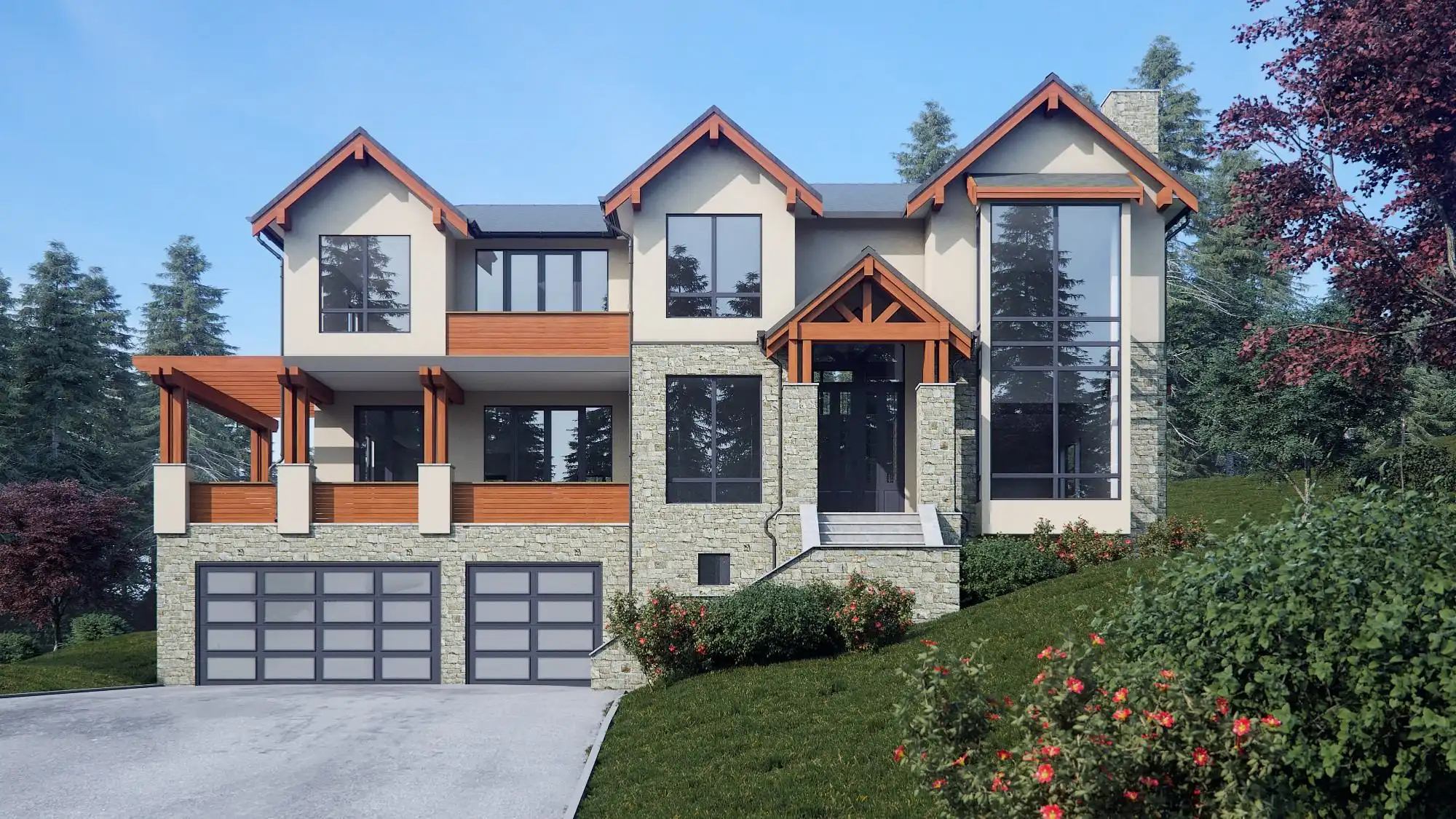 Perfectly suited for a sloped lot, this stunning modern plan has plenty for the whole family to love. Beginning with the lowest level, every inch of this 5,404 square foot, 5 bed 5.1 bath layout, is open and enjoyable. A 3-car drive under garage and a flex space make up the lower level. The main floor has a formal and informal living room, both an indoor and outdoor kitchen, a home office, and even a guest suite with its own private patio. The upper floor has the rest of the bedrooms, including the relaxing master, complete with a large sleeping space, as well as a full spa bath with a soaking tub, and a walk-in closet full of storage capabilities!