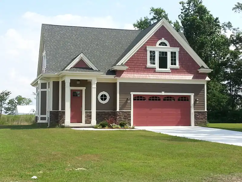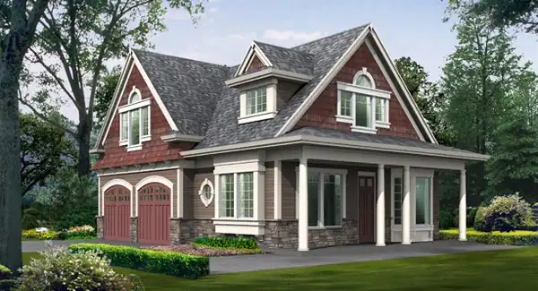 This plan offers a flexible layout that works well as a guesthouse or a small home. A broad entry porch opens into a dramatic living area with loft above. The extra-deep two-car garage provides lots of extra storage space. Each upstairs bedroom has an end suite bath. The exterior is enlivened by timeless dormers, a variety of palladian, bay and boxed windows, along with stone and shingle siding.