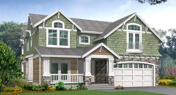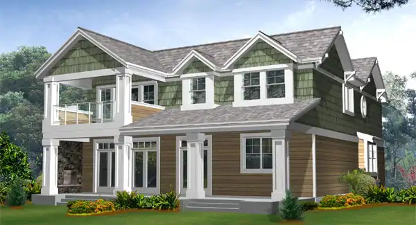 Welcoming the challenge of creating impactful curb appeal and an open-living floor plan to fit a compact footprint, the Woodland delivers on all counts. This popular plan offers a dynamic gabled exterior accented with brackets and stone. A dramatic foyer and luxurious curved stair lead to an oversize great room, nook and kitchen, complemented by a huge covered rear porch with fireplace. A formal dining room with walk-in pantry and butlery plus a work-at-home den complete the main floor. A luxury master suite with covered deck, two bedrooms with a Jack-and-Jill bath, a bonus room, loft-study and laundry comprise the upper floor. The Woodland packs a lot of features into a very appealing package.