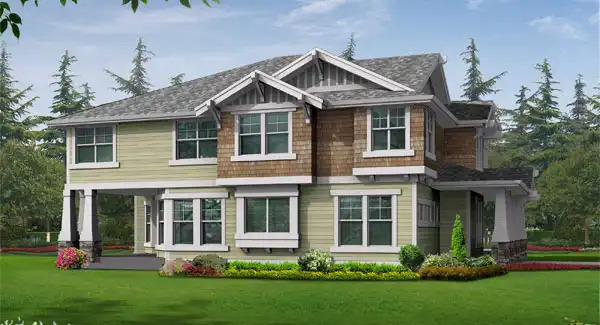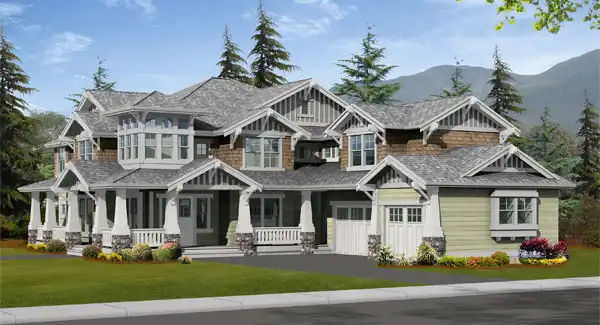 Beautifully ornamented with luxurious detailing, the Brackendale creates a sumptuous expression of contemporary Craftsman design. Its welcoming wrap-around porch features muscular tapered square columns atop rugged stone bases, setting the stage for an elegant composition of gabled roofs that culminate in a unique square corner turret. The Brackendales floor plan provides traditional living and dining rooms accessed from the formal foyer, plus a den with an attached bath that doubles as a main-floor guest suite. The open central stairwell aligns with the 2-story great room, which brings sunlight deep into the heart of the home. The covered rear BBQ patio is perfect for outdoor dining. Upstairs, the grand master suite has a fireplace, exercise or sitting area, dressing room and corner-soaking tub with bay window, three secondary bedrooms, a play loft, a compartmented bathroom, and a large media room.