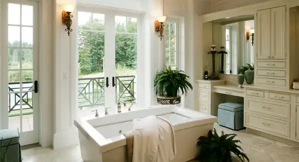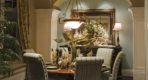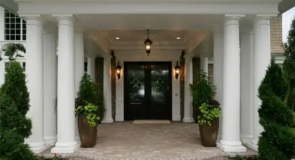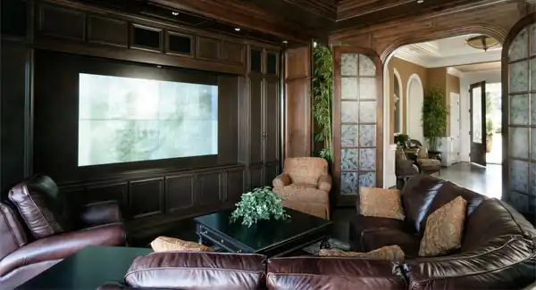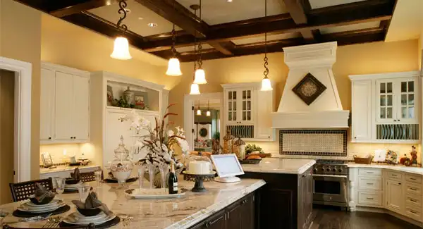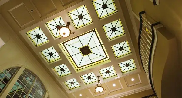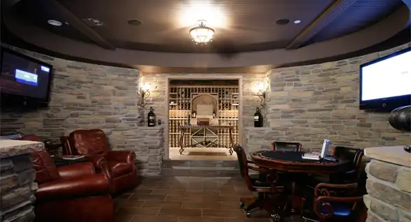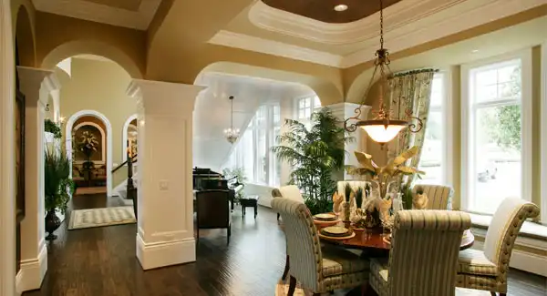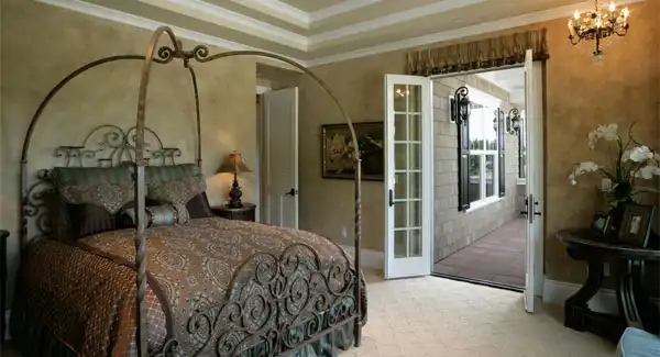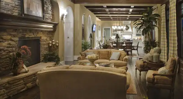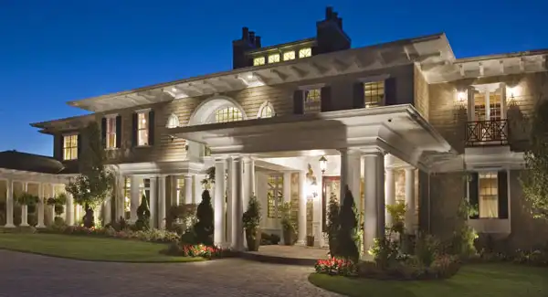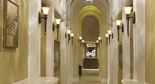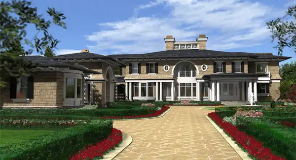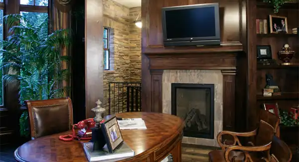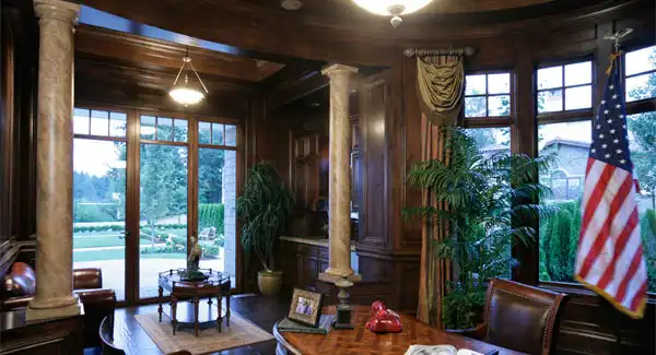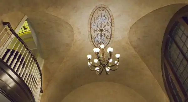 The entry opens to a soaring great hall with a grand stair, fireplace and overlook balcony. A central skylight floods the center of the home with sunlight, drawing attention to the sculptural ceilings. A false bookcase in the oval office hides a spiral stair to the wine cellar below.