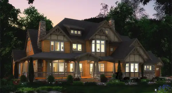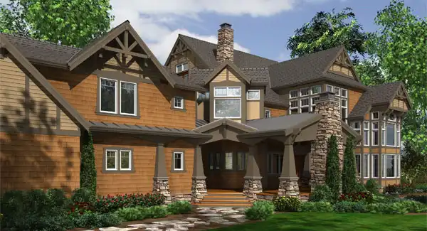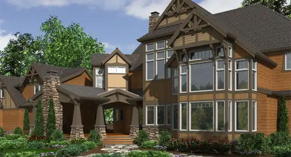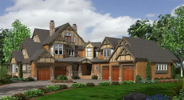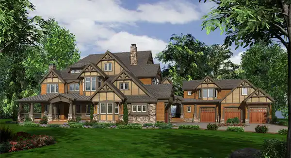 The Paradise Lodge is a spectacular luxury residence designed with powerful accents of Craftsman, Lodge, Country and Tudor styles. Arriving at the welcoming front porch, visitors enter the grand foyer with its majestic flared central stairway, with the grand, 2-story great room visible beyond. The formal living and dining room with butlers pantry are accessed via the foyer. The great room anchors an expansive family living area, including a sprawling island kitchen, intimate nook, a stepped-floor theatre perfect for true media enthusiasts and a private guest or exercise suite. A mud entry, pantry and 5-car attached garage complete the main floor. The second floor features three bedroom suites, a private office, a deluxe laundry, a huge bonus room with step-down games area and a magnificent vaulted master suite with sitting room, his-and-hers walk-in closets and a decadent bathroom. The unique third floor has a dramatic overlook to the central stair hall, a vaulted loft or office with balcony, a full bath and a secret room designed to tweak the owners imagination. A huge covered recreation porch connects the main floor to the guesthouse, offering an island kitchen/bar, a living area with fireplace and dining area. The guesthouse includes a pool bath and pool equipment room, a 2-car garage plus boat trailer bay and a complete, vaulted one bedroom apartment on the second floor.