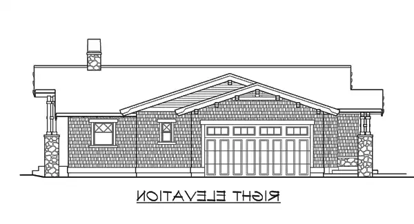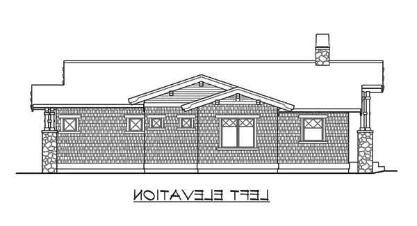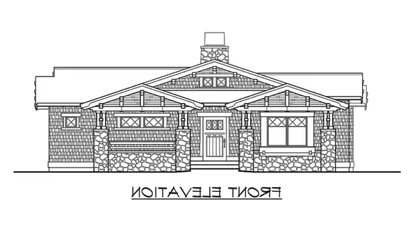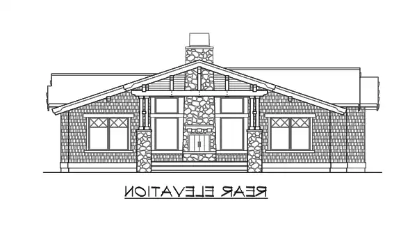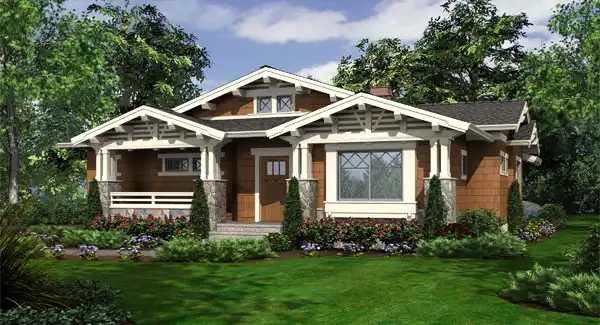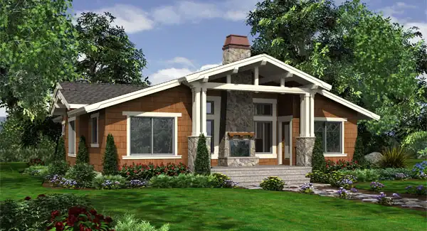 Designed to fit modern lifestyles while creatively integrating elegant arts-and-crafts details, the Fieldstone packs tremendous curb appeal and four-sided architecture into a compact footprint. The delightful facade is graced with sturdy four-piece columns atop rugged stone bases, robust beam brackets, and rustic shingle siding with inventively detailed, contrasting trim. The symmetrical entry opens to a strong internal axis that aligns through the vaulted great room and covered rear porch, linked by a dramatic see-thru fireplace. The kitchen and vaulted nook combine with the great room to create a spacious yet intimate family living area, with a vaulted den or third bedroom opposite. The vaulted master suite is located forward, with a second bedroom and bath/laundry in the center. The 2-car garage enhances the street elevation by locating its garage door on the side.