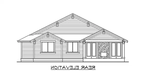An elegant craftsman ranch plan packed with fun features and logical livability, the Oakley offers open interior spaces, generous room sizes, and gracious covered front and rear porches designed for outdoor family living. The gabled facade, trimmed with robust brackets, shingle and lap siding, and stone wainscoting, creates a strong sense of place. An exciting interior element is the unique see-thru fireplace linking the great room and BBQ porch, flanked by pairs of French doors. The great room, BBQ porch, and master bedroom have vaulted ceilings.
