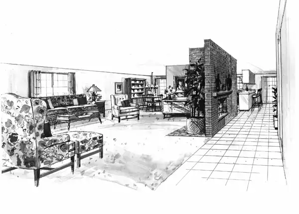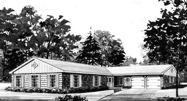 This practical, affordable ranch offers up to 4 bedrooms in a compact L-shape that is flexible to fit on many lots. There is a large family room with a two-way fireplace, which also faces the living room. The 4th bedroom could also serve as a den or home office.