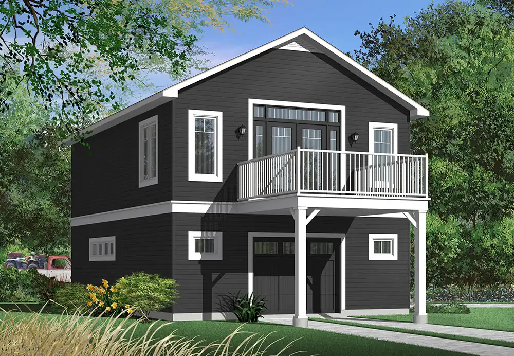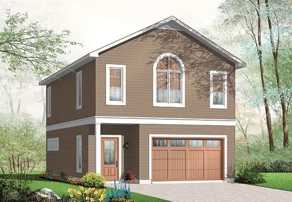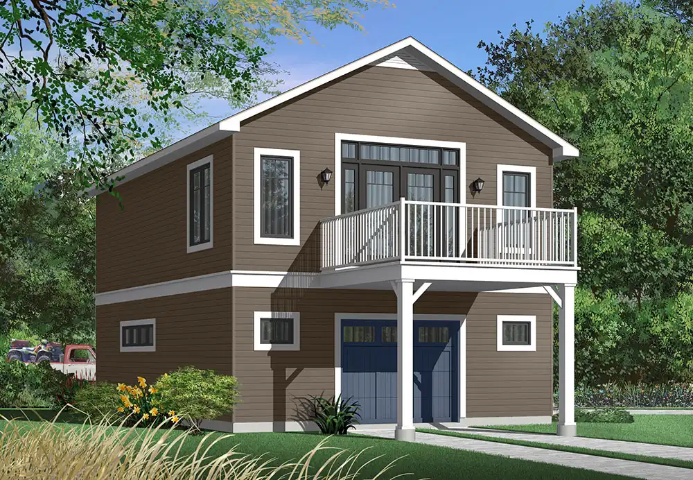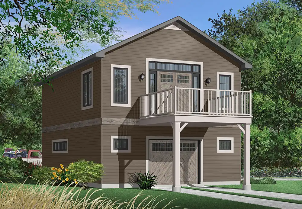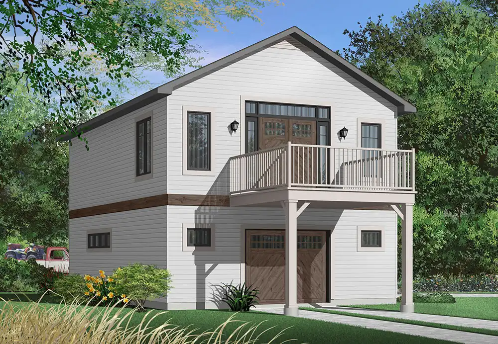 - this cottage style plan is a great option for the newlywed couple or those seeking to build a smart and practical home while saving some money. Packed within the walls of this home is 1,015 square feet, brimming with the charm and appeal that you would expect from a traditional country cottage. One bedroom and 1.5 bathrooms allows for privacy but usability in entertaining guests and having visitors. This 2-story home begins with a bottom level garage and workspace, great for the inner DIY’ers and hobbyists. Secondary garage access from the backyard allows for easy and functional usage of the space without having to move cars out. A large closet by the stairs is great for a coat closet or additional storage. The second story houses the living spaces and provides wonderful natural light, thanks to the large windows that are found on virtually every wall. Vaulted ceilings work with the natural light to give the home an even more open feeling about it. A powder room directly off of the stairs is great for guests and is easily accessible to the open layout. A large kitchen and dining room open on to the family room, as well as providing dual access to the 144 square foot deck, great for outdoor living and entertaining. A spacious master suite finishes this home’s floorplan, incorporating things such as dual closets and a large soaking tub. This home’s size doesn’t stop it from offering you the luxury and relaxation that you deserve.