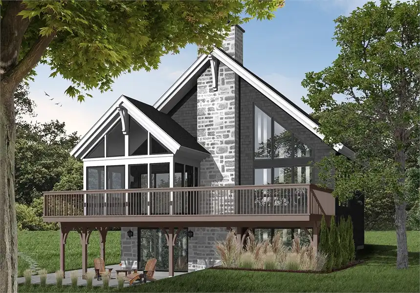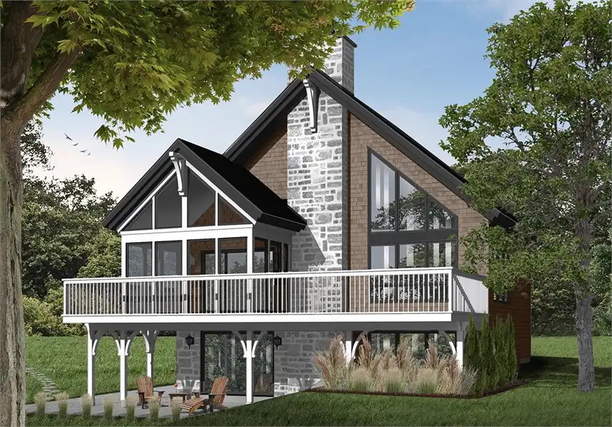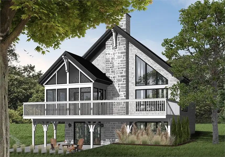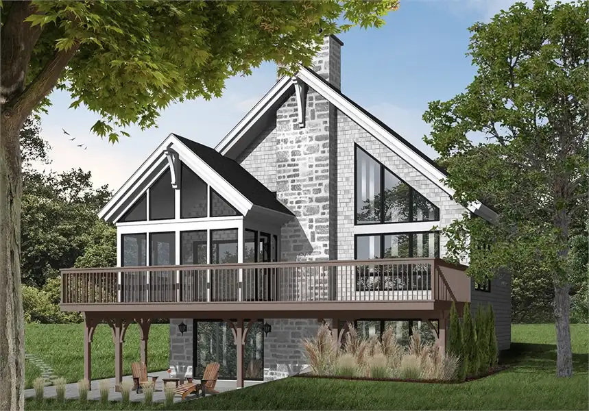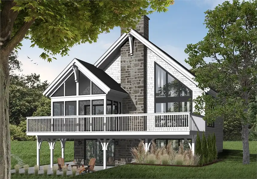 This brilliant craftsman cottage style plan. A sloping roof and cathedral windows immediately draw the eye, while other features seal the deal. Featuring 2,243 square feet, this plan has all of the space and functionality that you need to maximize your enjoyment of the home. Four bedrooms and 2 bathrooms allows for necessary space for kids and guests, while an expansive great room and sitting room draws everyone together. Stunning windows are accentuated by a cozy fireplace, great for evening conversations or cold winter nights. A sprawling kitchen and dining space open on to a large porch, complete with a screened-in portion, allowing for outdoor living without the annoyance of insects and pests. The first floor is completed by the master suite and its amazing bathroom and luxurious spa tub. The second level of this home finds a lofted bedroom and sitting area that is open to the living room below. This area is great as another sleeping area, or as a game room or play space for the kids. A walk-out basement finishes this floor plan as well as offers additional bedrooms and access to outdoor living space. This plan is a great option to consider as a lake or mountain house and is large enough to be a vacation or year-round home.