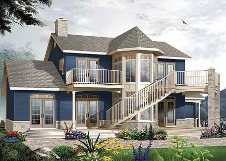 This savvy 1953 sq.ft. design showcases three bedrooms, 2.5 baths, a solarium and a bonus room. A playroom shares a bath with bedroom #2 and a second living room. There is even a mezzanine, terrace and main-floor master bedroom suite. A fireplace draws folks to the living room, while the U-shaped kitchen turns into the breakfast area. The dining room looks up to a bright two-level atrium.