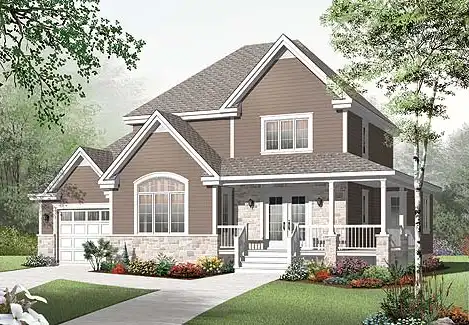 A wraparound porch welcomes guests to this charming country-style home. Repeating gables make the porch cover roofline even more prominent. Inside, a generous foyer includes a seating area. Every inch of the living area is efficiently used. Guests will enjoy the forward living room and kids will love spying over the stair rails. Cooking is a joy in this spacious kitchen and meals can be enjoyed at the eating bar or adjoining dining area. A discreet shower room with laundry closet completes the main level. Upstairs, the master bedroom includes a walk-in closet and shares a family bathroom with two secondary bedrooms. The attached garage opens conveniently to the kitchen and also includes a staircase to the basement.
