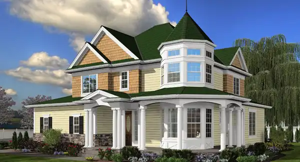 The Windsor brings a fresh perspective to Victorian style, featuring a striking octagonal turret enclosing a main floor den and upper floor master suite, surrounded by a wraparound front entry porch. The updated floor plan is organized around a large great room with open dining and kitchen spaces. Upstairs are the spacious master suite, two secondary bedrooms, bathroom and convenient laundry.