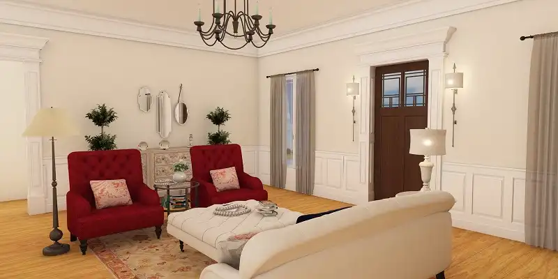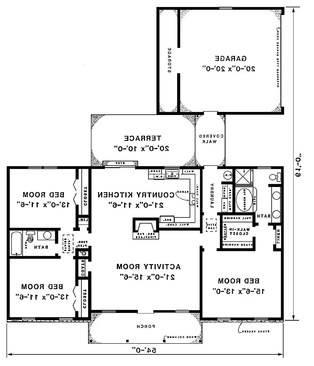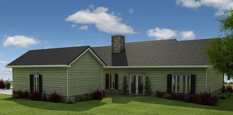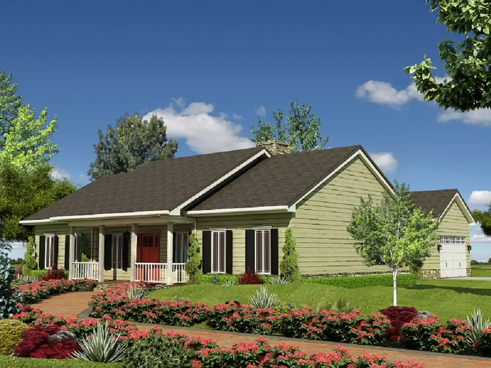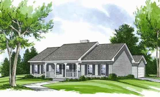 The interior of this home offers a unique and practical floor plan layout. Entrance is to an enormous centrally located great room embellished with a fireplace for cozy evenings. The great room flows to a spacious country kitchen, which includes abundant cabinet space. The breakfast area has a view of the terrace and rear yard or the great room. There are three bedrooms, with the isolated master suite featuring a large walk-in closet, linen closet, private spa bath with separate shower, garden tub and twin lavatories. The remaining bedrooms are luxuriously sized and in a wing of their own, on the other side of the home. Each has a large closet and they share a central bath. A convenient laundry room provides access to the double garage through a covered walk. Extra storage is provided in the garage for lawn and garden equipment. Plan number Z-500 includes 1,598 square feet of heated space and is available on a crawl space or slab foundation. A sheltering porch and offset gable roof lines create a classic country exterior.