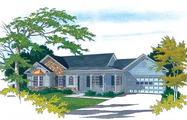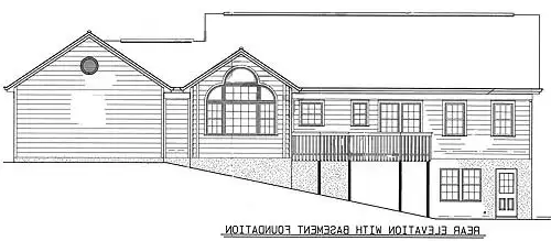 A covered front stoop leads into a dynamic great room, featuring a recessed tray ceiling, open stair to the basement and uninterrupted flow into the large dining room. A fireplace is included in this area and a sun deck is to the rear of the plan. The lavish kitchen is enhanced by extra cabinets and a food preparation area, an angular bar sink opens to the breakfast room and a cased opening to the formal dining room. Entry from the garage is through the laundry and breakfast area. Notice the wide bonus pantry or storage closet located adjacent to the breakfast room. Gardening and yard care supplies are conveniently kept out of the way, in the storage room from the garage. There are three bedrooms and two baths. A central bath services daytime use and the family bedrooms, while a private luxury bath enhances the master bedroom. A tray ceiling is shown for the master bedroom. Closets throughout the bedroom wing provide an abundance of storage. The European exterior is enhanced by decorative arched top multi-lite windows, stucco finish with corner quoins, multiple gable roof design and a covered stoop.