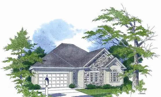 A bold roof detail harmonizes with an elegantly appointed exterior to create comfortable living quarters within compact dimensions. An entry hall provides access to all areas of the home. A half bath is included. The dynamic great room merges virtually effortlessly with the dining area of the home. The ceiling is vaulted and a recess is provided for an entertainment center. A U-shaped kitchen includes modern amenities along with a snack bar bordering the dining area. Adjacent is a large screened porch for meals or relaxing. The double garage is shown with an abundance of storage space for gardening equipment. While the three bedrooms are grouped together on one side of the home, the master suite is accessible from the great room. It includes a tray ceiling and is generously sized. An enormous walk-in closet, linen closet and luxurious garden bath complete the luxury. The laundry room interconnects to the front bedroom hall and also the master bath, making laundry day chores a breeze. The roomy family bedrooms are on the front of the home, clustered around a full bath. Each bedroom includes amble closet space. Linen storage, coat closet and attic access are convenient. Exterior enhancements include horizontal siding, stone, arch top windows and a combination hip and gable roof.