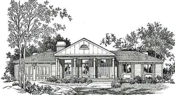This modest three bedroom ranch is simple, practical and very affordable. It is good looking too, featuring a three-tiered roofline that is nicely balanced. The central gable covers a large, high front porch. The living/great room features an 11 foot high ceiling and a fireplace.