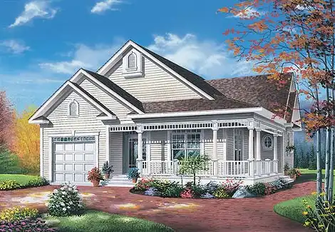 This delightful country cottage combines elegance and charm and is enhanced by lattice trim details over the wraparound covered front porch and front facing garage. A spacious sunken living room is located directly to the left of the entry hall. The dining room is situated centrally and allows for easy entertaining from the adjacent kitchen. This efficient kitchen boasts a breakfast bar and a pantry as well as double sinks. After dining, your family and guests can easily move directly onto the covered porch to relax and continue to enjoy themselves. Two bedrooms, each with its own closet, share a full bathroom.