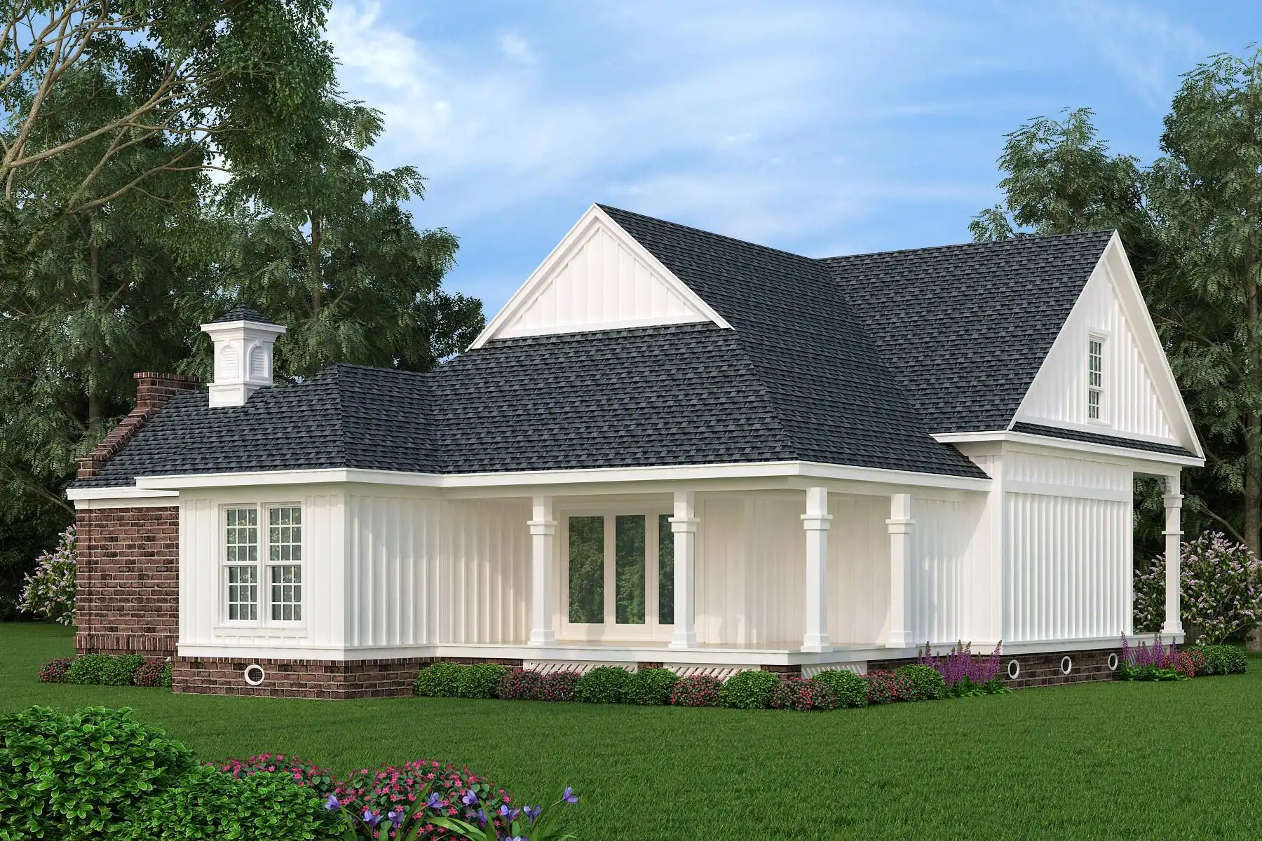 House Plan 3316 is made for anybody who wants classic architectural appeal in a smaller, more affordable package. With a full-width front porch and exterior symmetry, this Southern cottage has a grand feel despite its modest 1,236-square-foot size! It offers three split bedrooms and two bathrooms as well, with the master suite in front and the secondary bedrooms in their own hallway in back to promote family privacy. The eat-in kitchen has plenty of space to cook and serve, and the living room has a raised ceiling and connects to another porch to expand its space. House Plan 3316 would make a wonderful traditional home for a budget!
