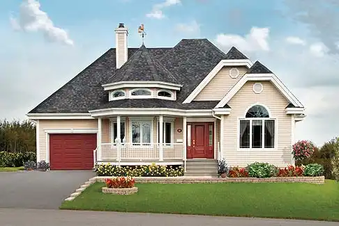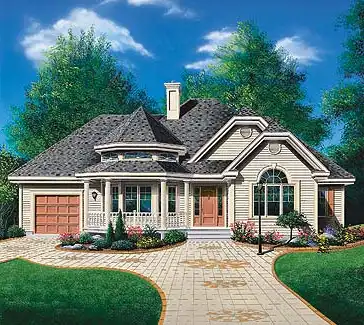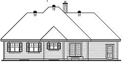 This small home backs a lot of drama and elegance in its 1,370 sq. ft. The family room features 13' cathedral ceilings, a fireplace and access to a gazebo-style front porch. The dining room and kitchen with lunch counter cook up a bright mealtime atmosphere. The master bedroom with walk-in closet is closely related to the full bath and two secondary bedrooms mirror each others windowed beauty.