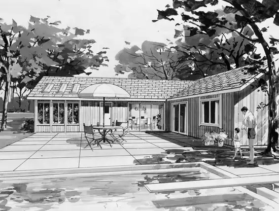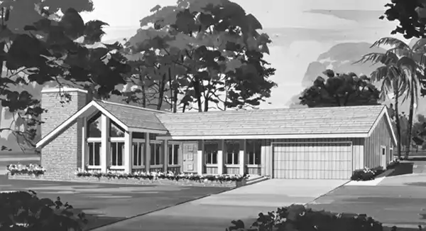 This sharp looking very affordable ranch looks good to the street but is also very focused on the rear yard. The kitchen and master suite view and open directly on a lovely rear patio. Planters help define a lovely entrance courtyard. The dramatic front living/great room features a vaulted ceiling and fireplace. Note the optional 97 sq.ft. greenhouse/plant hobbyist room facing the rear patio. The space could also be used as a workshop or storage area connected to the garage.