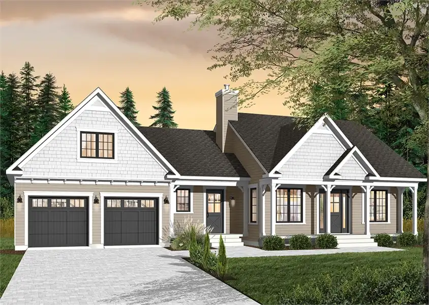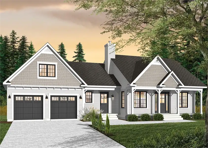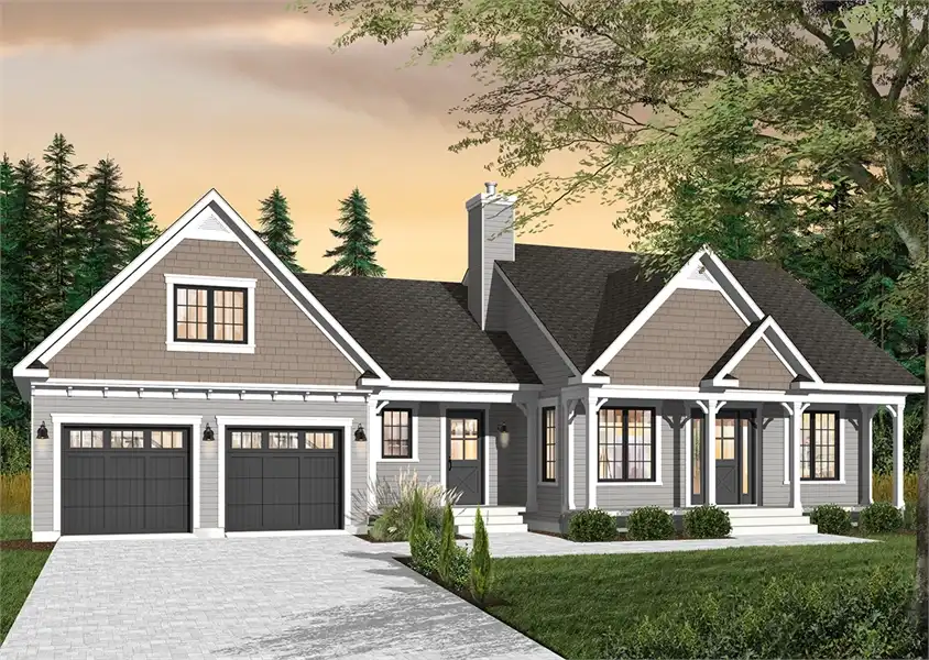 This spacious ranch style plan is not to be outdone by the many hidden features that it offers. A simple yet traditional front façade welcomes you towards the home, while the double garage and covered front porch provide enjoyable functionality to the space. Within the 1,398 square feet of this plan, you will find 3 bedrooms and 2 bathrooms, as well as an easily modifiable unfinished basement that can effectively double your living space. The flexibility of this home doesn’t stop there. Two front entrances allow for easy coming and going, with one door opening directly in to the large living room, and the other in to a foyer and coat closet space. An expansive open layout finds the kitchen and dining room together, with enough space for a large table and hosting big dinner parties. Two bedrooms are found past a shared full bathroom at the end of the hall. For smaller families or new couples who may not need all of the bedrooms, this is the perfect space to turn in to a nursery or an office, or even an in-home workout room. Much like the exterior of this home, the layout can be modified to fit your every need and to ensure a functional and enjoyable home for years to come.