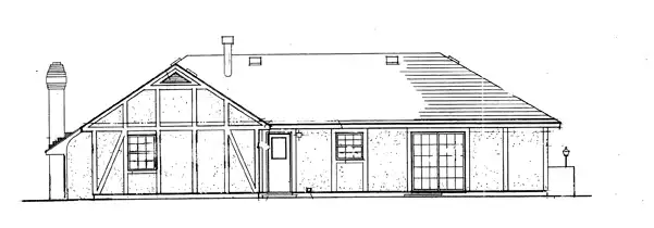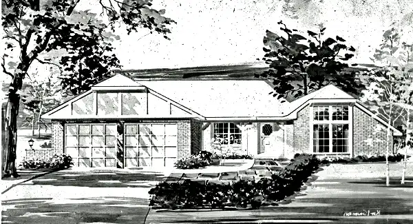 This modest, affordable, L-shaped ranch is designed to maximize privacy on a small lot. The recessed porch enhances the charming craftsman influenced front. The home features a dramatic vaulted front living room with the family function rooms oriented to the rear patio. There is great interior circulation with ready access to the rear. The private master bedroom overlooks the rear patio as well.