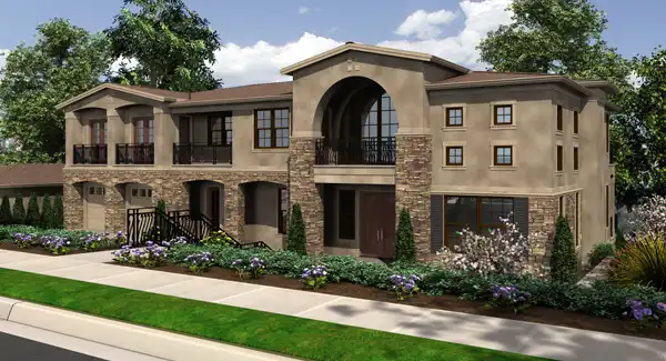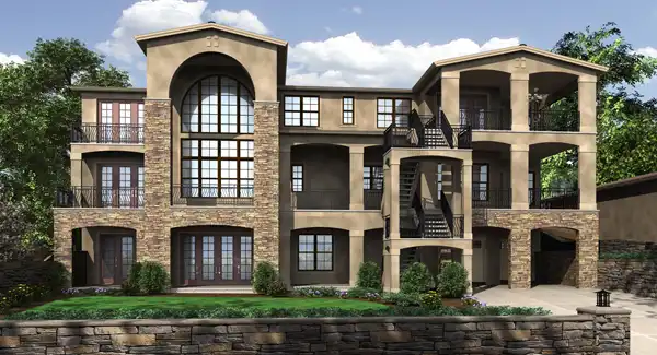 Capturing the easy elegance of a grand Old World hillside estate while taking advantage of a magnificent view, the Valencias adventure begins with its arched stone entry, leading into a dramatic two-story bridged foyer with living room beyond, a cathedral-like space defined by its eight impressive heavy-timber trusses and a huge window wall directed at the view beyond. The private left side of the main floor holds a luxury guest or parents suite, formal powder room and 2-story library. A large formal dining room opens to the right of the foyer. A chefs gourmet double island kitchen, butlery with walk-in pantry, huge glazed nook and family room with multiple covered decks and rear outdoor stair provide spacious all-weather view living areas, while a convenient elevator, circular back stair, mud room and 2-car garage complete the main floor. Upstairs, the owners will enjoy the grand master suite with its sitting room, see-thru fireplace, deluxe master bath and huge walk-in closet. A special feature is the masters private covered deck with spiral stair to a roof-level widows walk. Also upstairs are three deluxe bedroom suites with private baths, the upper library catwalk, elevator, laundry and an enormous bonus room. The lower level includes a massive 4-car tandem garage, elevator, mechanical and storage room, twin stairs, wine cellar and tasting room, movie theatre with snack kitchen, combination recreation room and game room with see-thru fireplace, covered patios galore, and a deluxe nanny, guest or in-laws suite with laundry. Thoughtful design touches like niches, arches, columns, cased openings; extra storage and private decks distinguish spaces and circulation throughout this extraordinary home. The Valencia is a grand expression of traditional design elegance that integrates all the luxuries and conveniences enjoyed by modern lifestyles.