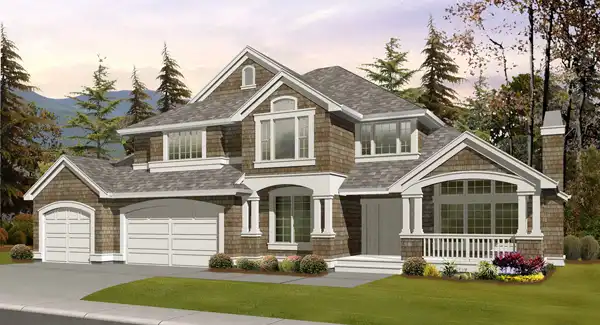 Terrific curb appeal combined with a family-friendly floor plan make the Trillium Lane one of the designers most popular plans. The graceful arched gables and traditional craftsman trim details create a delightful composition. The dramatic double-height foyer beautifully displays the unique angled stair, while efficient circulation allows for generously sized rooms, including the oversize island kitchen, nook and family room. The grand master suite offers an octagonal sitting area, large walk-in closet, and a spacious master bath. A guest bedroom with ensuite bath and two additional bedrooms with a jack-and-jill bath complete the upper floor.