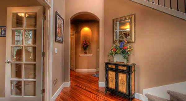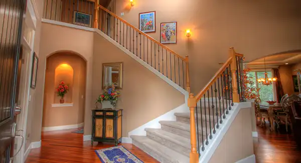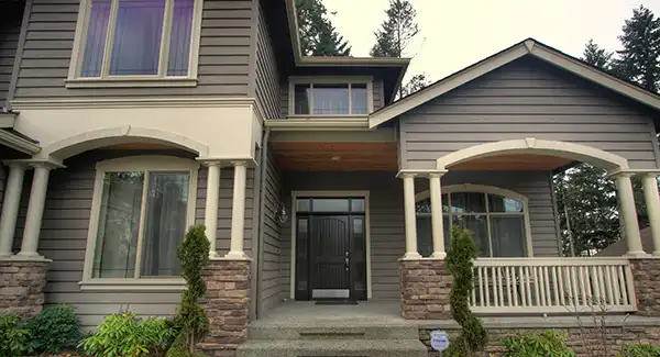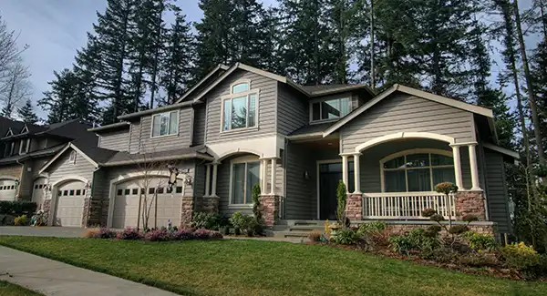 The graceful arched gables and traditional craftsman trim details create a delightful composition.