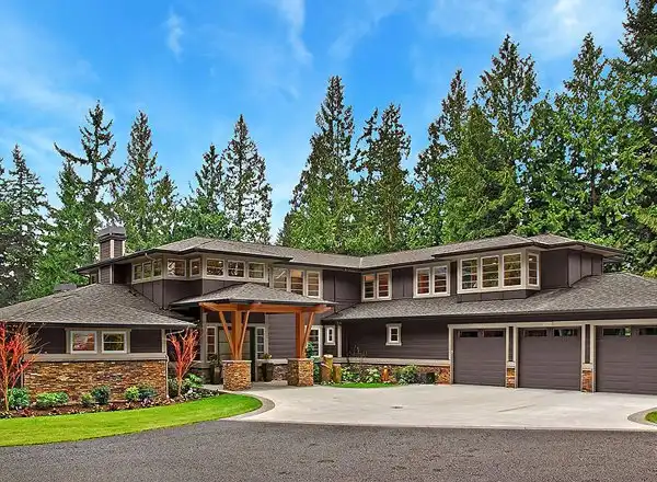 Sleek rooflines and stone accents embellish the façade of this modern four-bedroom house plan. The layout of the home plan boasts surprising features. For example, you wouldn't expect to find an office, a workout room, a wine storage room and a BBQ deck on the main level. The dramatic great room draws the eye upward. The wide-open kitchen is the family chef's dream. The peaceful master suite offers deck access for romantic stargazing. Three more bedrooms and two baths are located on the second level. The bonus/media room is large enough to host several friends for a fun movie night.