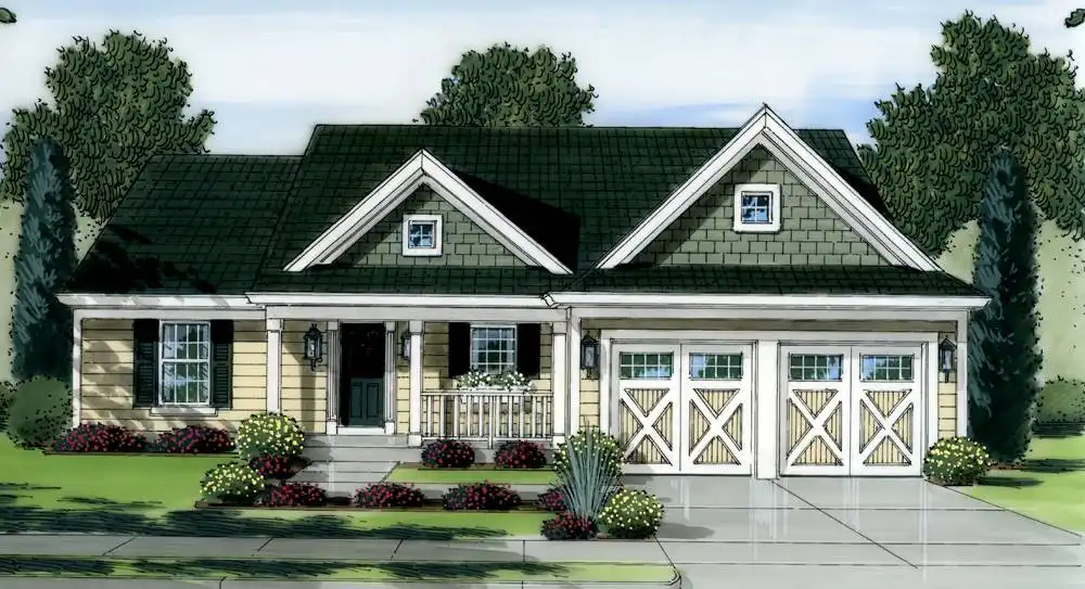 Welcome to this affordable, 1,321 s.f. house plan featuring 3 bedrooms. This design welcomes you with an inviting and relaxed front porch. You enter the home directly into the warm and cozy kitchen which leads directly into the great room with fireplace. Sloping ceilings gives that farmhouse look yet allows bright windows to let the sunshine in. The split bedroom plan gives privacy to all members of the family. On your left you’ll have access to the master bedroom with ensuite bath and walk-in closet. The laundry room is also located on this side of the home as well as direct access into the garage. The other side of the home is where you’ll find the secondary bedrooms and second bathroom as well as stairs to the walk-out basement just waiting for your design to make it your own. This lovely home has a lot packed into a small space and is designed to impress, despite its small size.