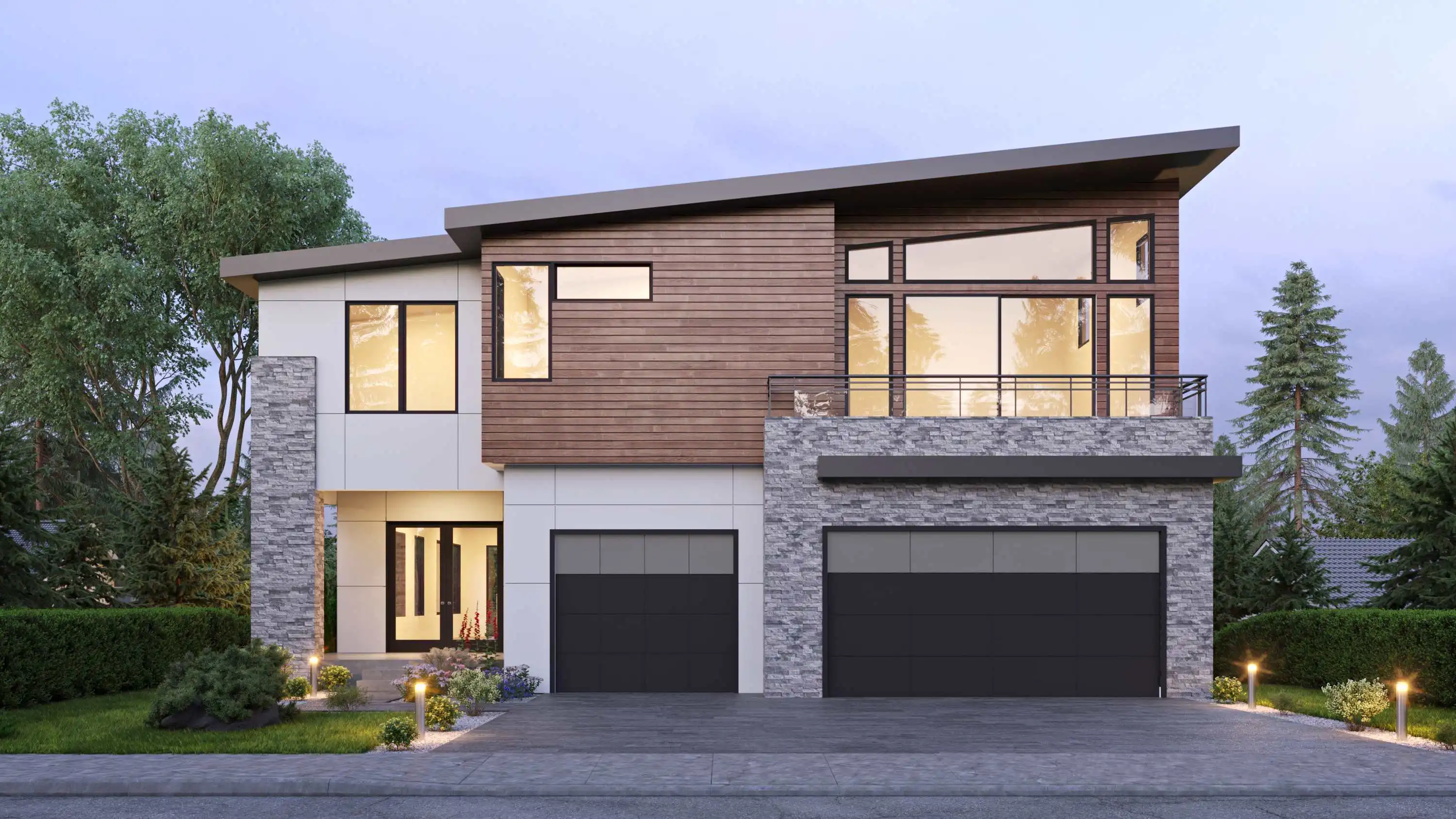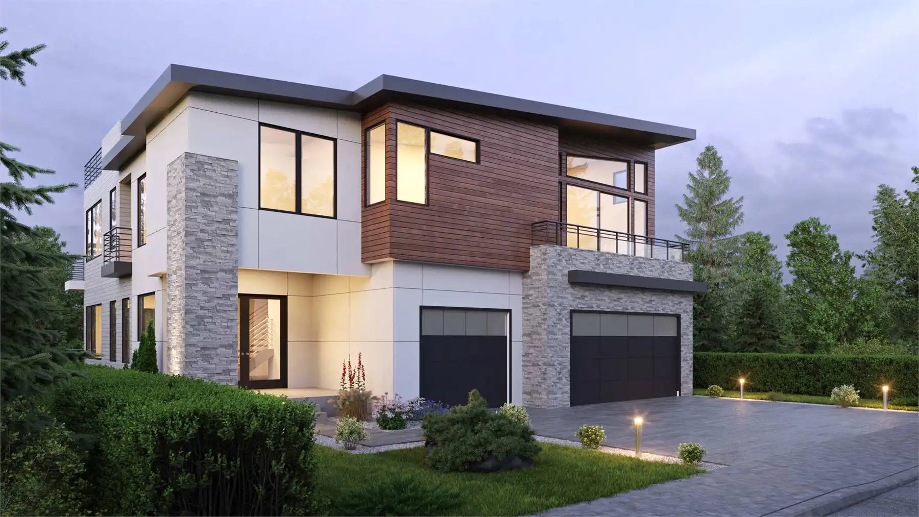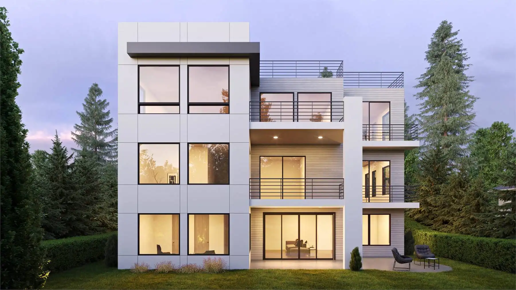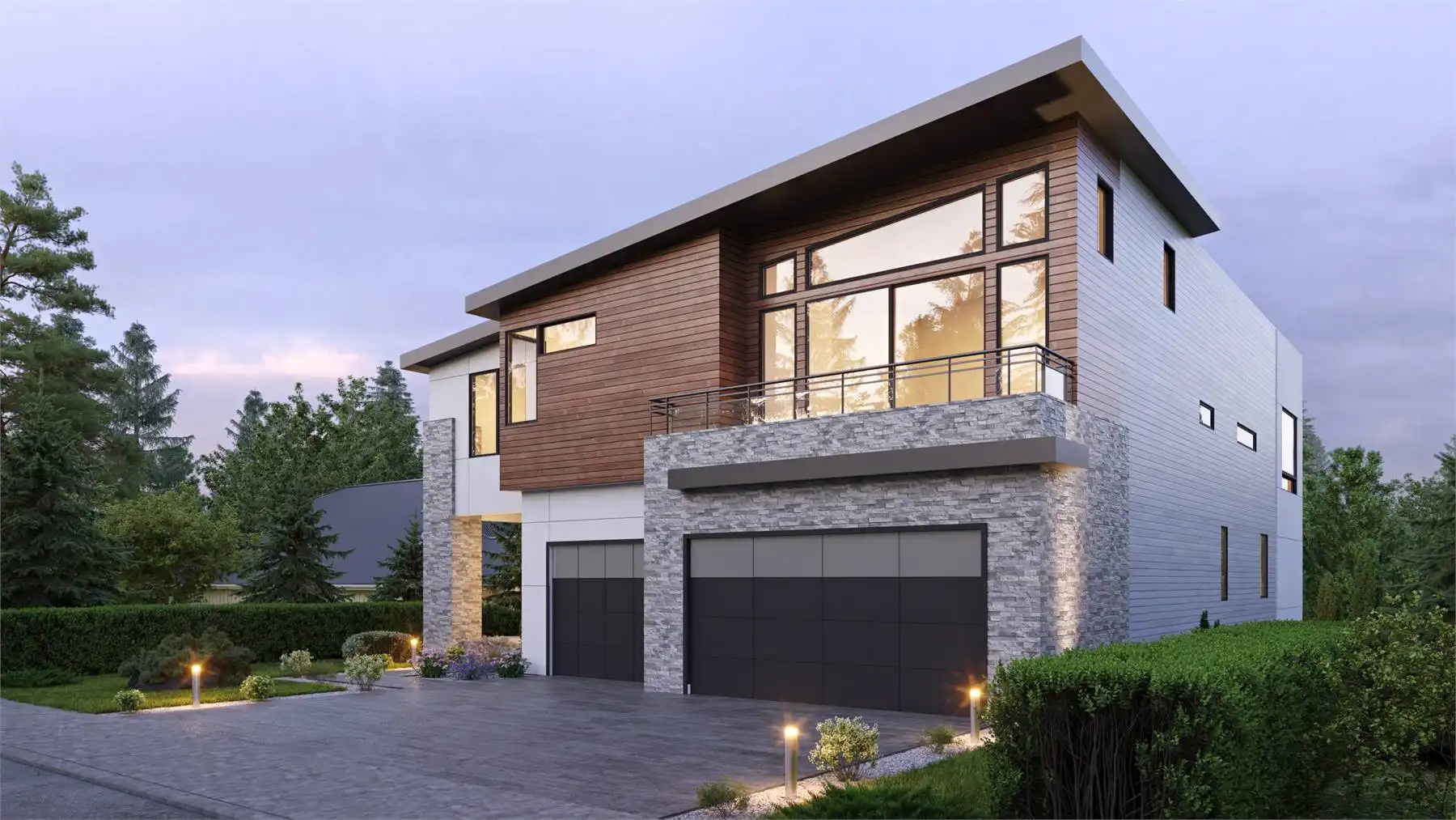 House Plan 3425 is a stunning contemporary home made to make the very most of a sloping lot! It offers 5,471 square feet with five bedroom suites plus three powder rooms across two stories and the finished basement. You can access all the floors with the stairs or an elevator! This inverted layout places the main living areas on the top floor to help them take in the best views, so let's start from the bottom. The basement includes a rec room with a fireplace and a wet bar and a pair of Jack-and-Jill bedrooms. The entry level includes two bedroom suites, a leisure room, and a laundry room. The top floor is where you'll find the luxurious primary suite, a laundry closet, the spacious open-concept great room, and an office. But wait--there's more! The exterior landing behind the office has stairs up to the roof, where there's a large rooftop deck. Pair this with decks and the patio across the other floors and this home is an outdoor living dream!