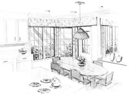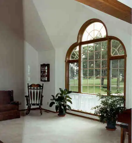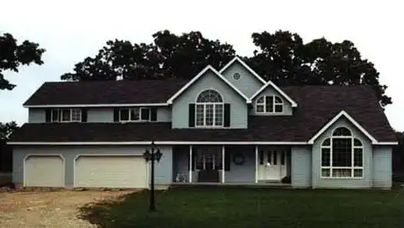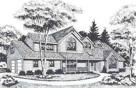 Modern rooflines and arched window treatments dress up this farmhouse-styled home. A skylit, cathedral-ceilinged foyer opens to the upper level. It is flanked by a formal dining room and a sunken living room with cathedral ceiling. Merging with the living room is a sunken family room with a huge fireplace and sliders that access an attached rear deck.