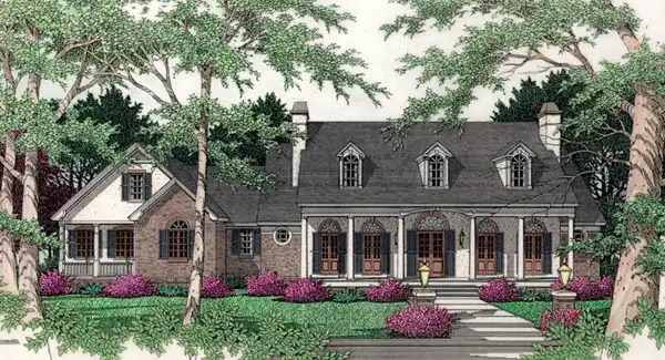 A scrolled arched entrance, Roman Doric columns, and beveled leaded glass transoms over fixed French doors are all carefully detailed to create this elegant classical home. A vaulted living room opens to the balcony above. The secluded master suite enjoys a vaulted ceiling. Two additional bedrooms share a full bath; each room has direct access to the bath.