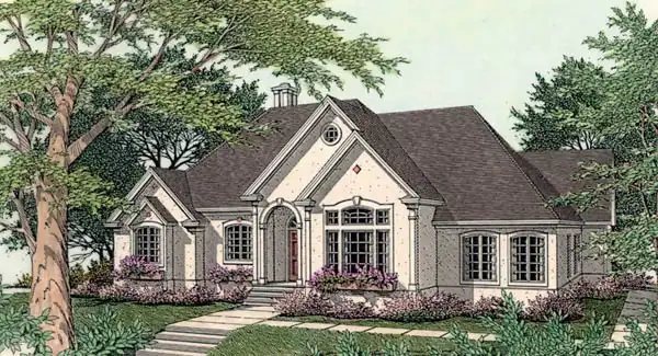 The arched entry leads to the 10' foyer which separates a vaulted, formal dining room and study. The private master suite features a tray ceiling and triple windows. A vaulted ceiling covers the bath. Privacy is assured by the remote location of the two additional bedrooms. Basement option increases living area by 58 square feet.