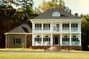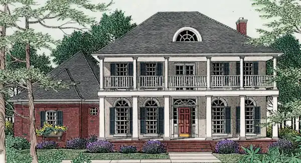 An old south plantation home is represented with this design. The exciting floor plan offers a curved staircase and columned kitchen opening to the great room. The ceiling in the breakfast room soars which allows for the balcony above.