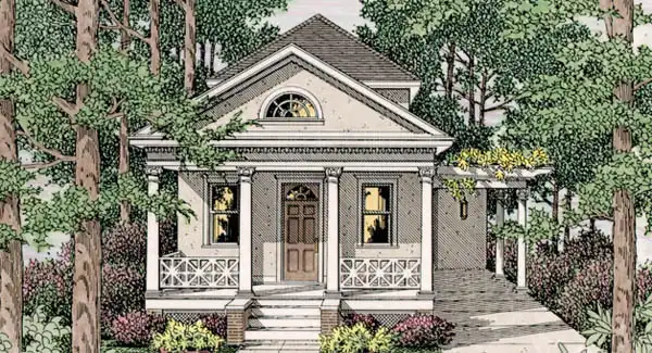An elegant home designed for narrow spaces. The front porch and side deck are great for enjoying the outdoors. Inside the living spaces are large and the kitchen presents an island snack for which offers additiional seating and storage space. The master suite has private access to the covered deck while the additional bedrooms upstairs share a roomy sitting area.