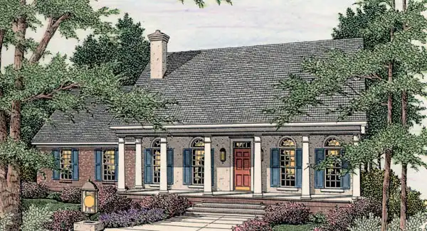 Stately columns strengthens the presence of the front porch. A no nonsense floor plan offers a great use of space. Large bedrooms with walk-in closets, built-ins surrounding the fireplace in the great room and a multifunctional island snack bar in the kitchen are just a few of the amenities included in this design.