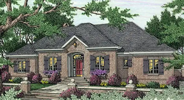 Romantic appeal with subtle curves and charming wood accents. Each bedroom is large and offers a walk-in closet while the center bedroom could have alternate uses with entrances at both ends of the room. The living spaces are open with a angled snack bar connecting the breakfast and great room to the kitchen. Built-ins surround the fireplace in the great room.