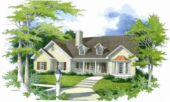 A sheltering covered front porch is instrumental in the appeal of this country style home, with a warm rural feel. Entry is into a central corridor, which feeds the first floor. Read a good book by the central fireplace in the great room. Direct passage is into the breakfast room and kitchen area of the home. The kitchen includes abundant cabinets and counter space, and the breakfast room is a bright informal area. Nearby is the formal dining room, which is positioned for privacy. Also included in this area, and placed for convenience, are a half bath and a laundry room. Access to the oversized double garage is adjacent and the garage includes lots of storage. The master bedroom is on the first floor, providing splendid isolation for the homeowner. A tray ceiling provides definition, and a sitting bay enhances the room. A sunlit spa tub is the highlight of the garden bath, which also includes a double vanity, separate shower and linen storage. A generous walk-in closet is alongside. Upstairs are two family bedrooms and an incredible bonus room. Imagine the possibilities for this room, from studio to storage. A central bath services the second floor. Arch top dormer windows and a bay window creating a quaint image emphasize a multitude of gable roof lines.