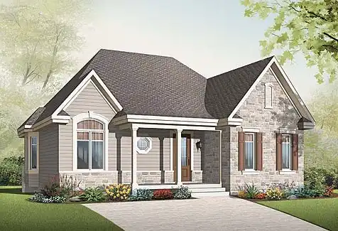The 1,173 square feet of this darling Craftsman house plan will make you feel right at home!  Forward-facing twin gables and double slope on the main roof create a pleasing combination of roof angles. A weather-lock vestibule provides convenient coat storage. Inside, an angled staircase creates a unique visual feature. Families and guests will appreciate an open living area with the two-sided fireplace separating the living area from the bay windowed dining area. An alcove to the rear provides a cozy conversation area or computer nook. The unique angle of the kitchen provides definition to the cooking area and an adjoining eating bar allows space for visiting or snacks. Two bedrooms enjoy generous closets and are well separated by a 5-fixture bathroom with independent bath and large angled shower. An undeveloped basement is a blank slate for additional living or storage spaces.