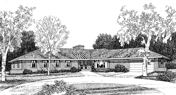 This angled ranch features a dramatic six-sided (hexagonal) great room with a vaulted ceiling and fireplace. The fireplace is two-sided and also faces into the adjoining living room. The design includes a U-shaped kitchen and breakfast area as well as four bedrooms and 2-1/2 baths. The angle allows flexibility of placement on your lot.