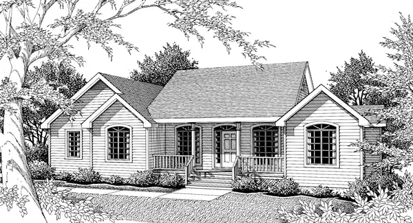 This modest, yet charming, ranch plan features a large front covered porch and a great interior floor plan. The porch opens into an expansive great room with a high ceiling and fireplace at the rear. The kitchen and breakfast nook face the front porch. A private master suite is to the right facing the rear. It includes a 5-fixture bath and his and her closets. Two other bedrooms are on the opposite side. Note the large storage area and workshop in the garage.
